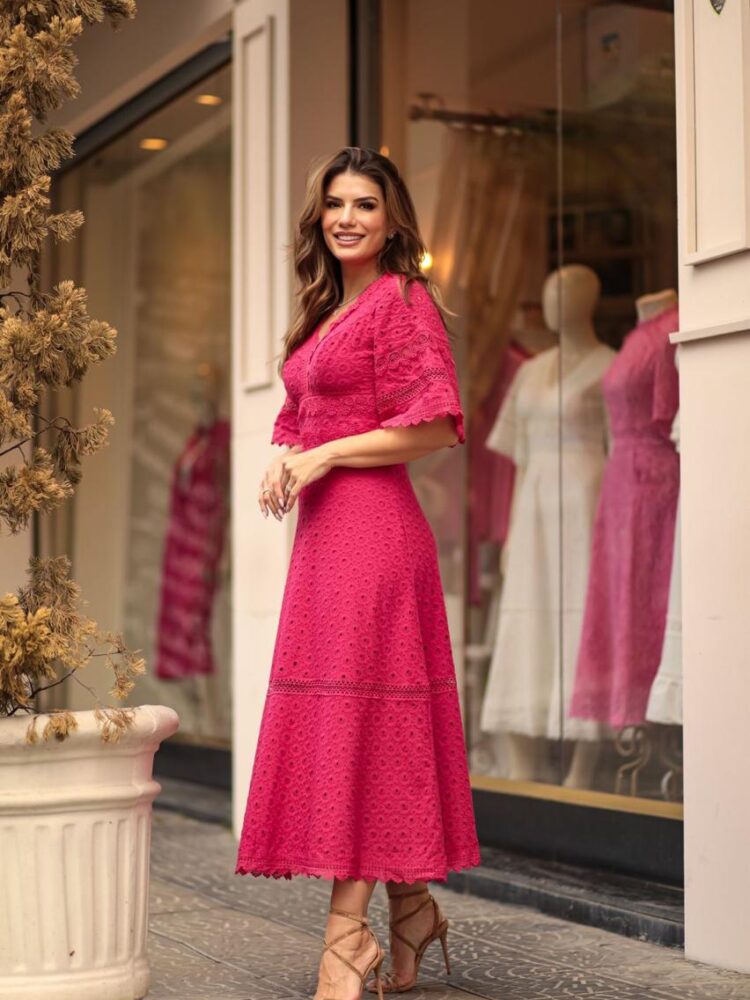 Vestido midi pink em laise com guipir (Doce Maria)