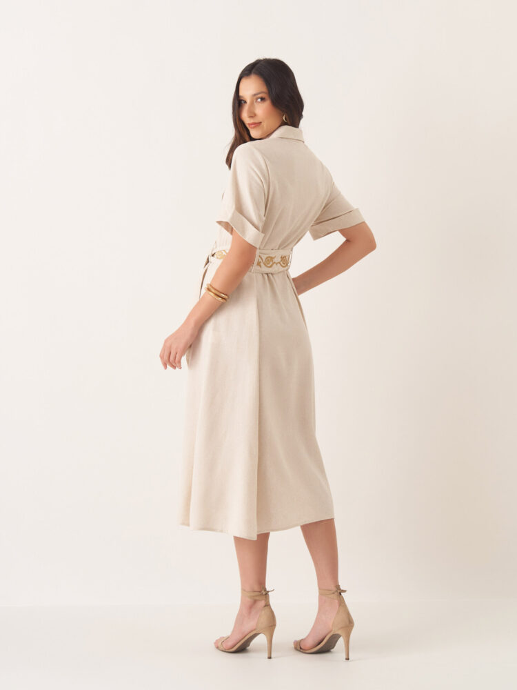 A combinação perfeita entre sofisticação e leveza. Confeccionada em viscolinho, esta chemise clássica traz um caimento impecável e toque suave, ideal para quem valoriza estilo com conforto. O cinto de cortiça que acompanha a peça realça a cintura com charme natural e sustentável, adicionando um toque moderno à modelagem tradicional.