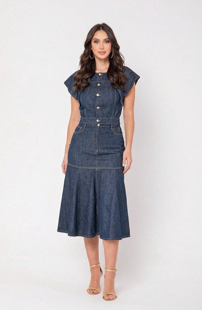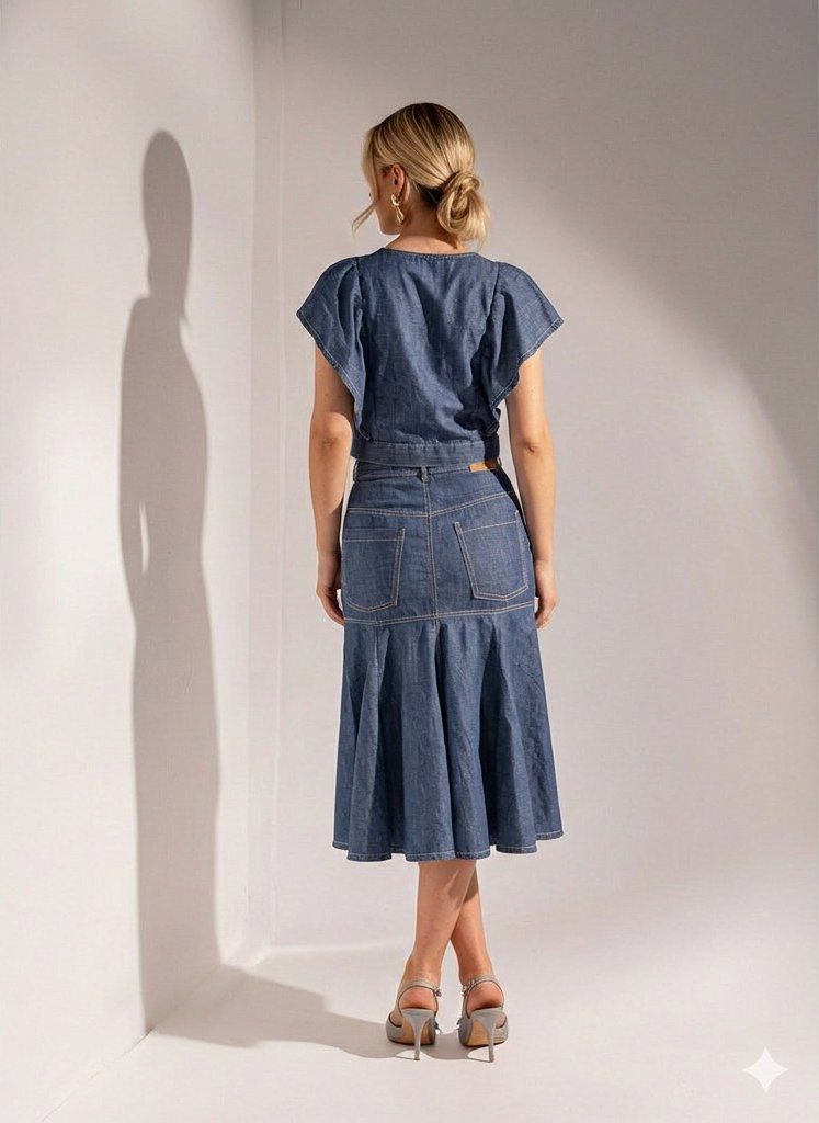 A blusa aprEsenta botões frontais decorativos e mangas delicadas, trazendo feminilidade e equilíbrio ao look. Já a saia midi possui corte preciso com barrado assimétrico e leve babado, que garante movimento elegante e acabamento diferenciado.