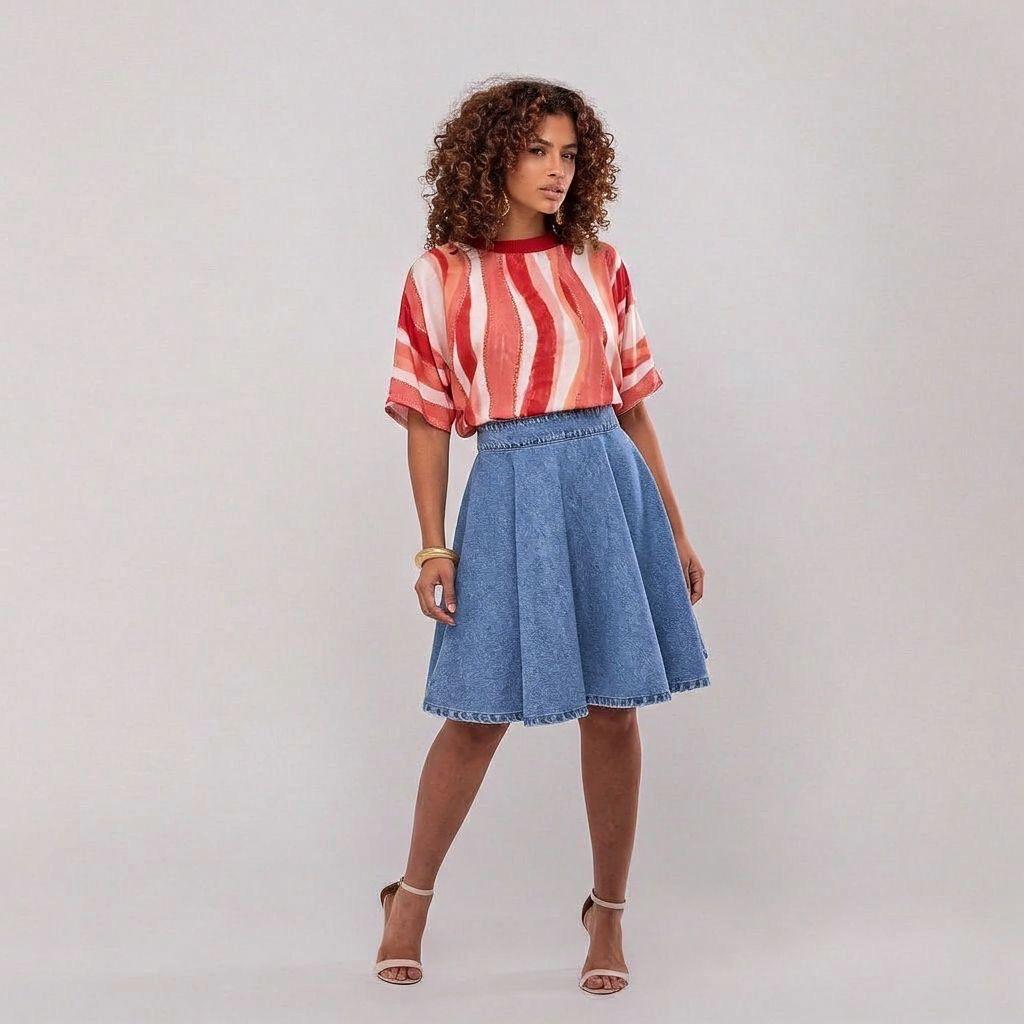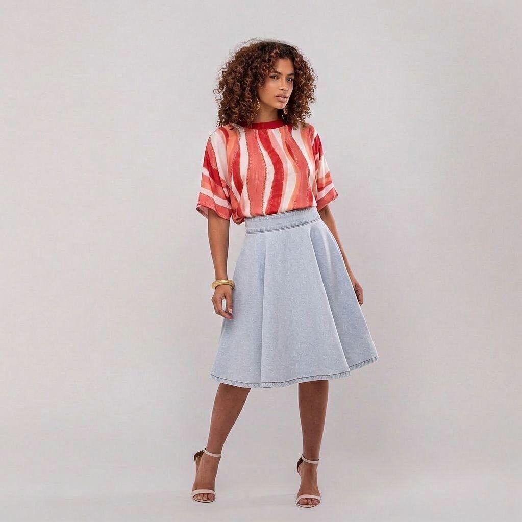 A Saia Jeans Ester é a tradução perfeita de estilo, romantismo e elegância atemporal. Uma peça pensada para mulheres que valorizam estrutura, postura e um vestir seguro — daqueles que atravessam tendências sem perder identidade.