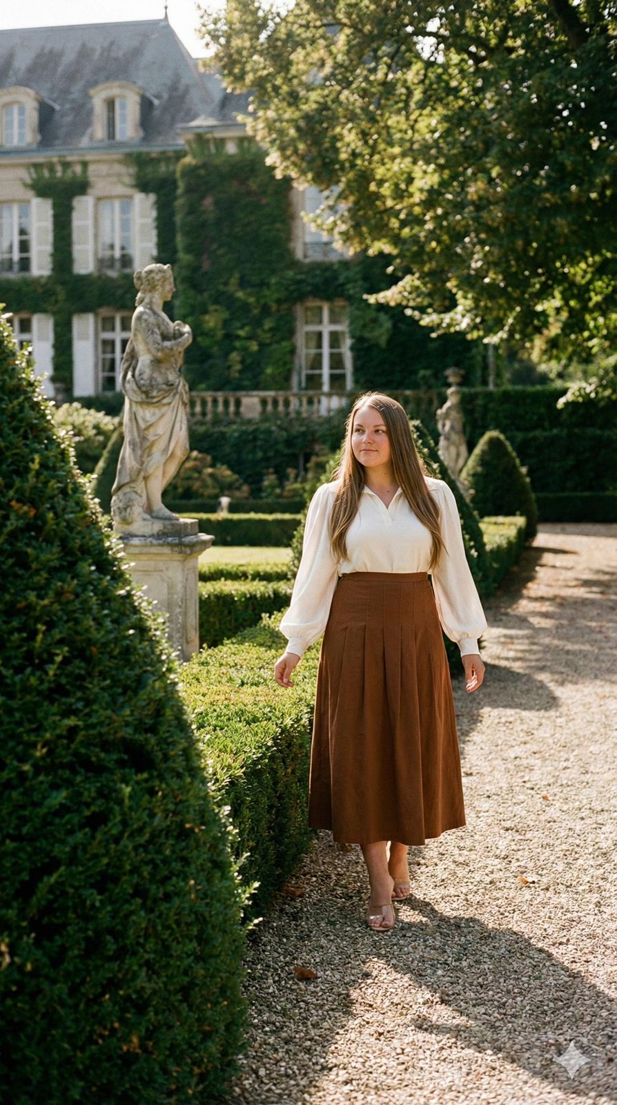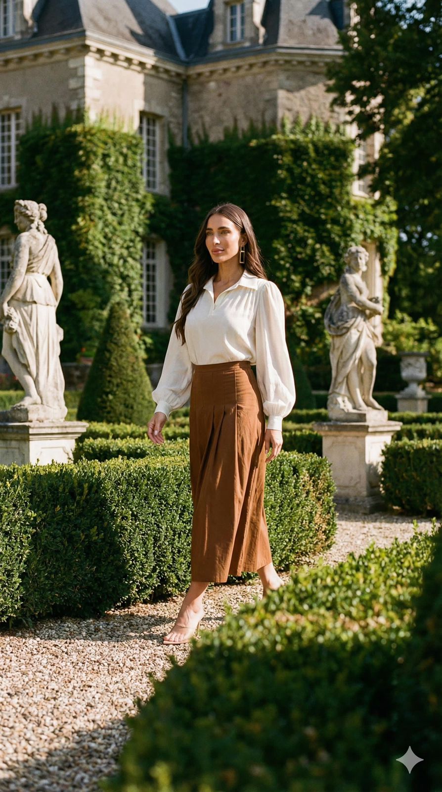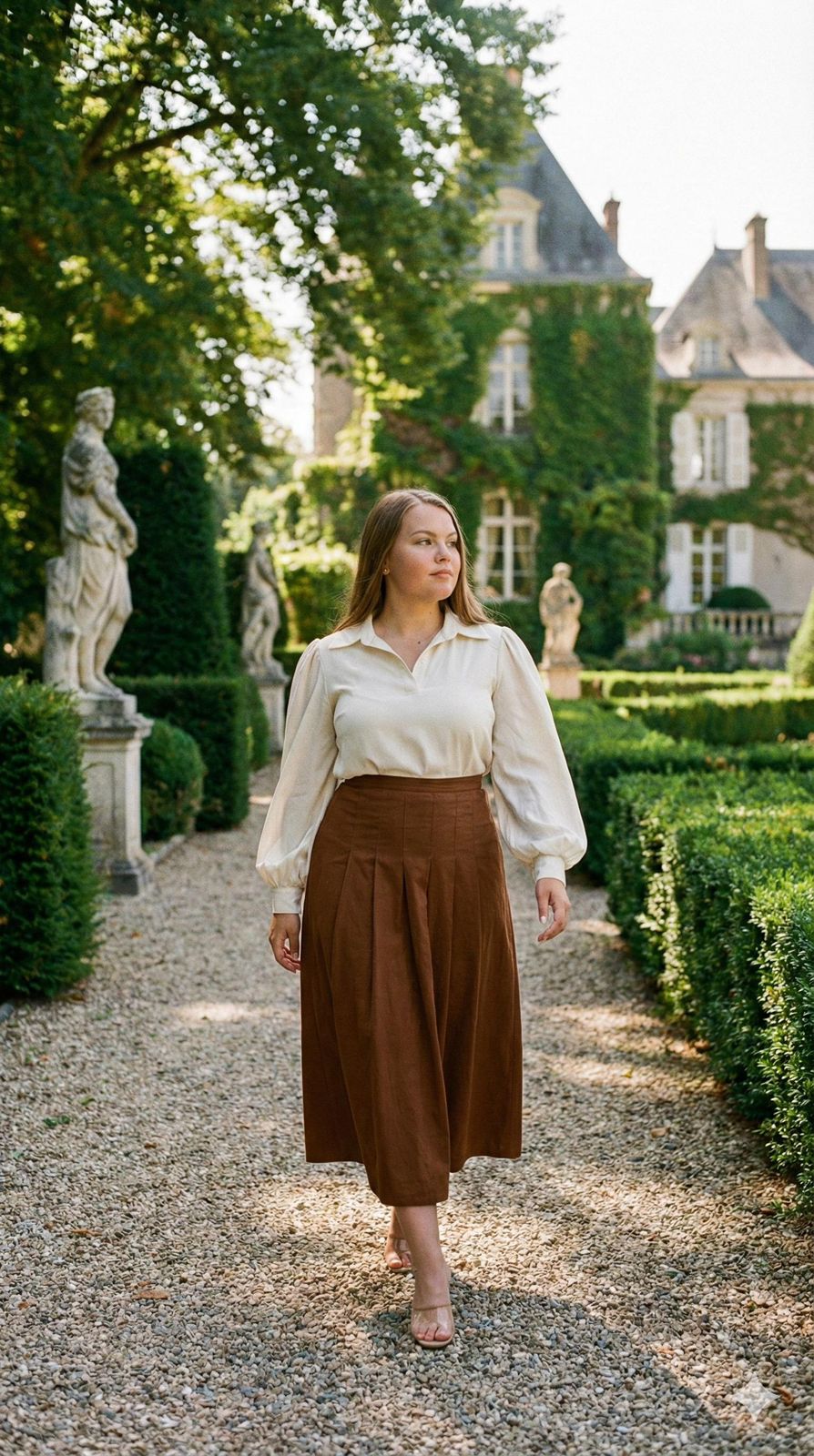 Sua modelagem evasê com pregas cria volume elegante e fluidez controlada, proporcionando movimento impecável ao caminhar, sem marcar o corpo. É uma saia longa que impõe presença com naturalidade, mantendo um visual sofisticado e contemporâneo.