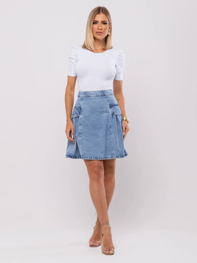 • Cor Azul Claro com 3 Lavagens : Desenvolvida em um tom suave de azul claro, azul me´diao e zul bem escuro a saia apresenta uma lavagem delavê moderna, que garante um visual contemporâneo e descolado, sem perder a classe.