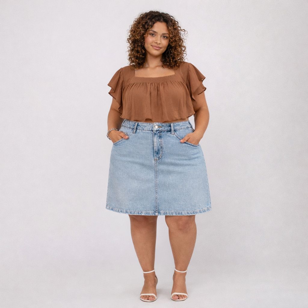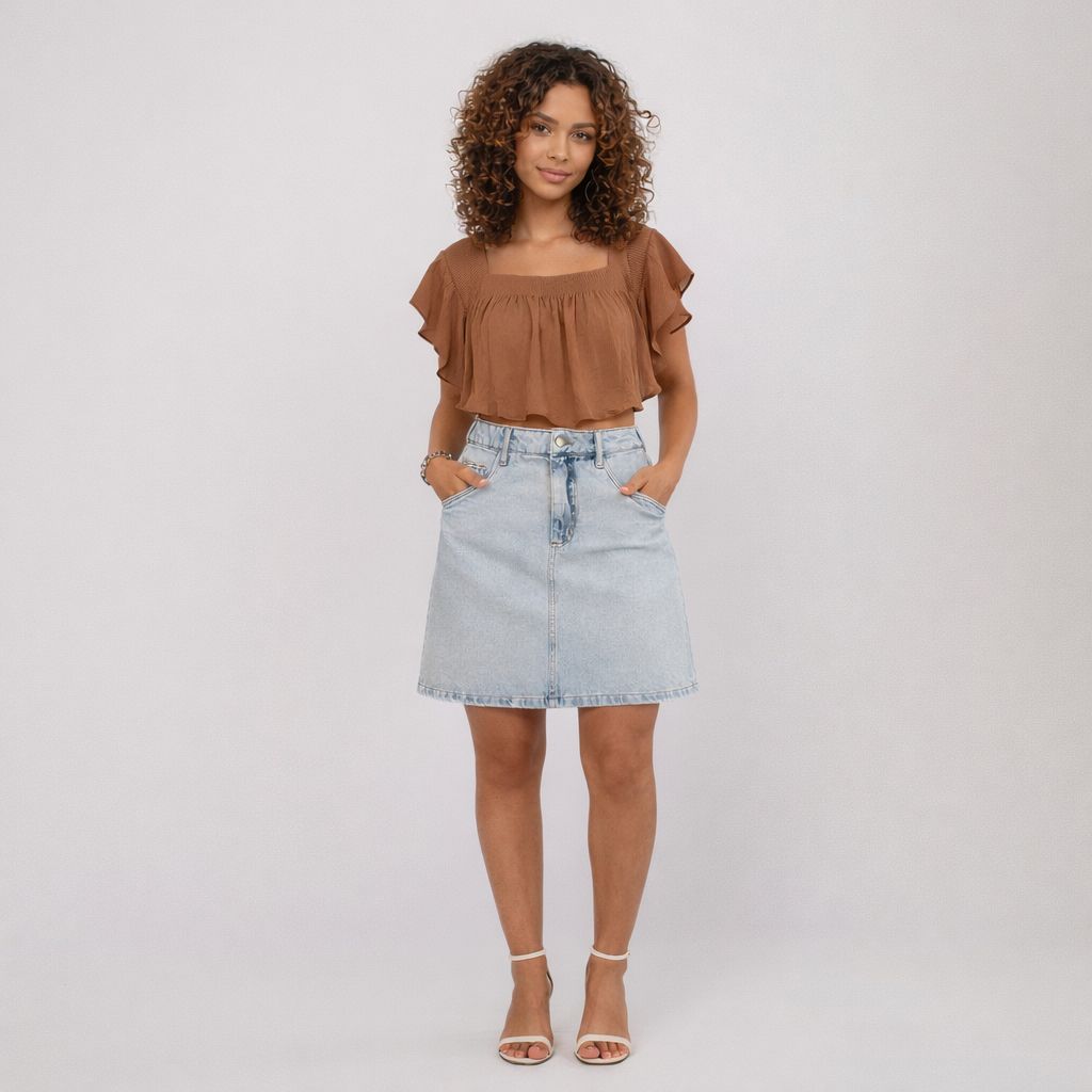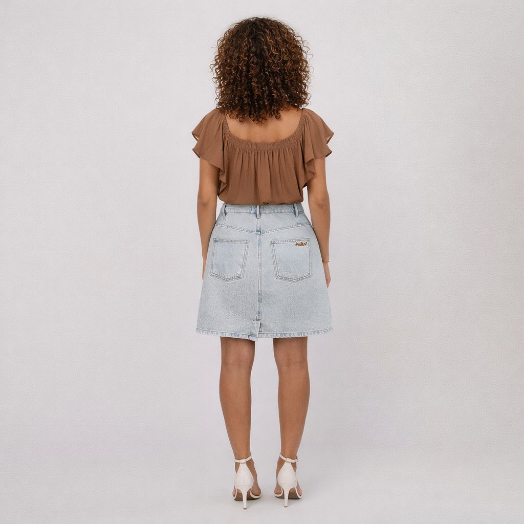 A Saia Martina é perfeita para quem busca leveza, frescor e praticidade nos dias quentes. Com comprimento acima do joelho e lavagem bem clara, ela traduz o clima do verão em um visual descomplicado, atual e extremamente versátil. Confeccionada em jeans 100% algodão, não possui elasticidade, oferecendo estrutura e caimento reto, clássico e atemporal.
