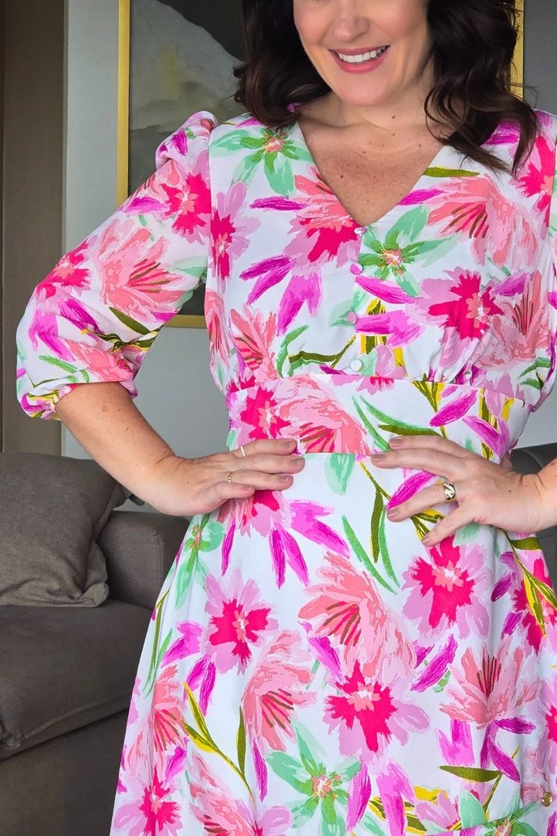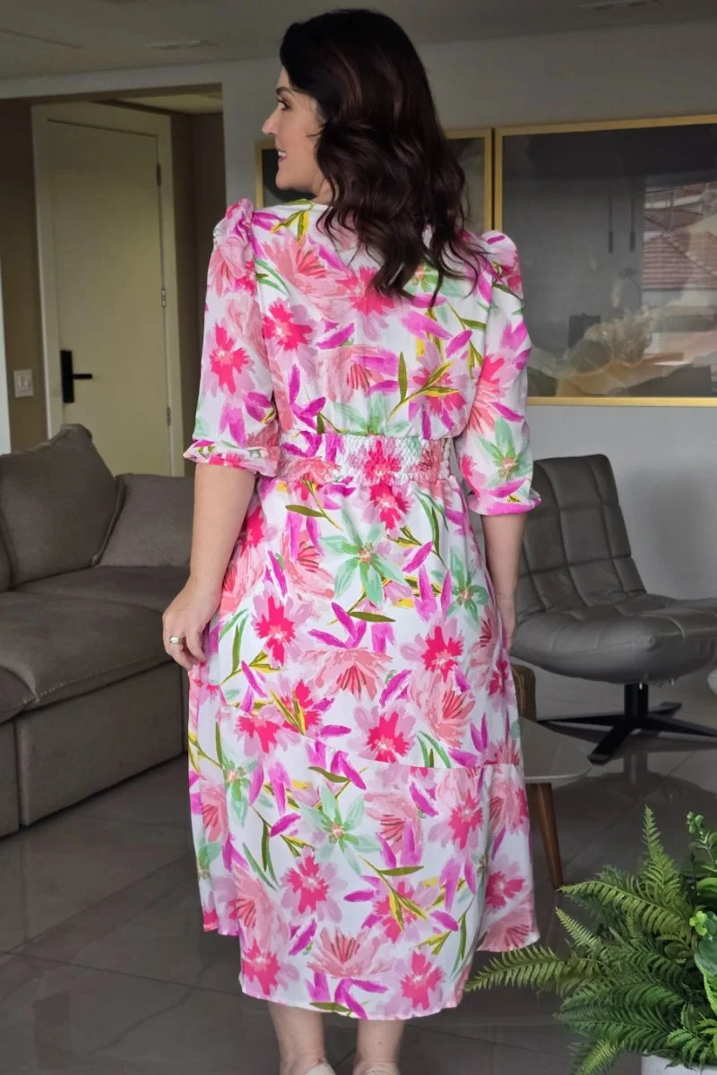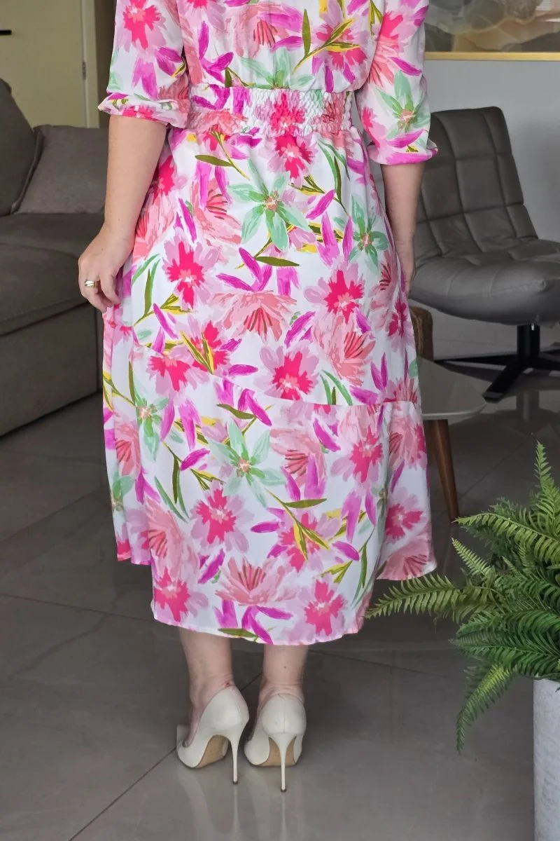 A estampa floral do Vestido Lorena combina tons de rosa, pink, lilás e verde sobre um fundo off-white, criando um visual leve, alegre e feminino. As flores em traços artísticos remetem à pintura em aquarela, trazendo exclusividade ao look. Uma estampa que transmite alegria, leveza e elegância — perfeita para eventos diurnos, cultos, jantares ou ambientes profissionais com um toque fashion.