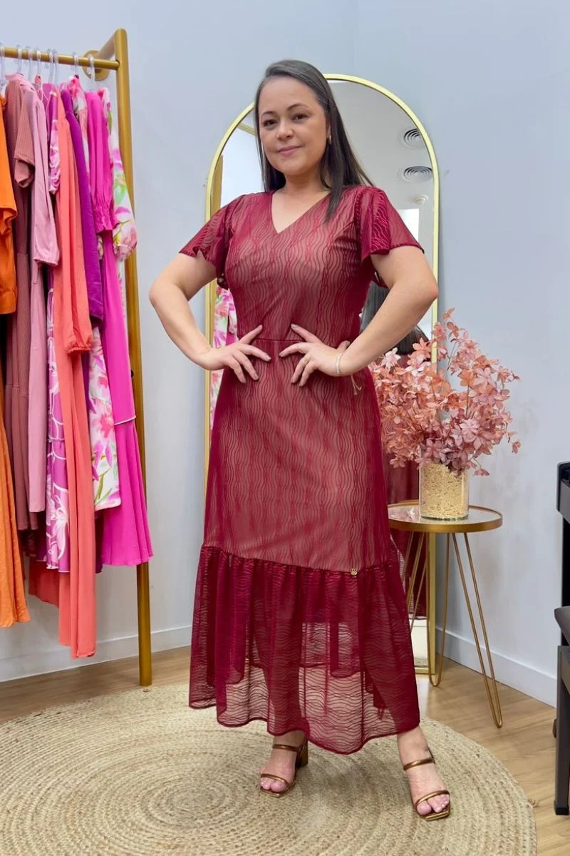O tecido em tule jacquard com elastano garante caimento leve, com desenhos em relevo que substituem estampas com discrição e modernidade. O brilho sutil do tule eleva o visual, tornando este vestido ideal para celebrações formais, eventos sociais ou religiosos. O forro interno mantém o conforto e a discrição da peça mesmo sob luz intensa.