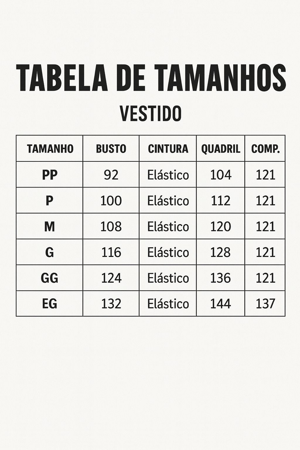 | BUSTO | CINTURA | QUADRIL | COMP. | |