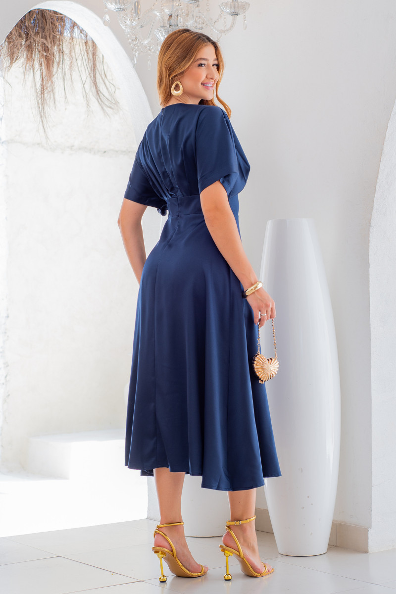 O Vestido Midi Élise Azul Marinho traz a força e a sofisticação de um tom clássico que nunca falha. Seu design une caimento fluido, brilho acetinado e modelagem elaborada para criar uma produção refinada, impecável e perfeita para eventos que pedem presença marcante.