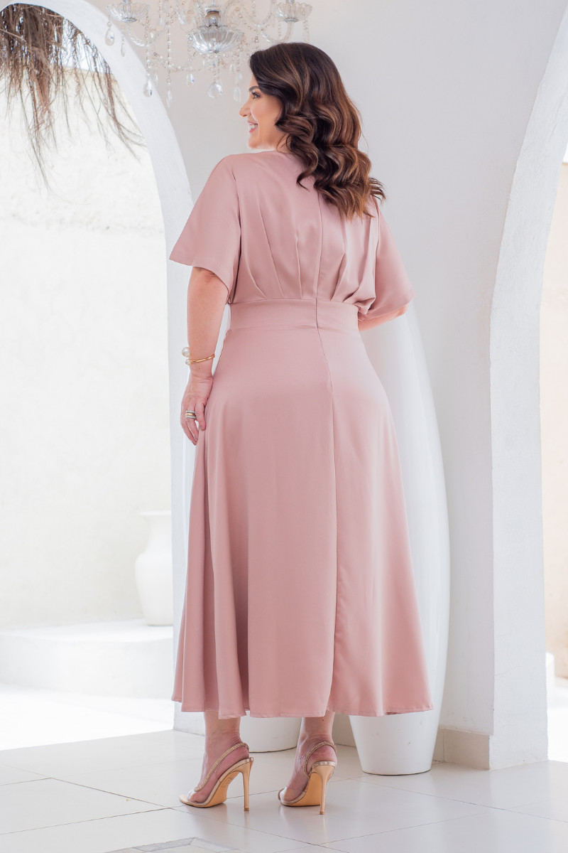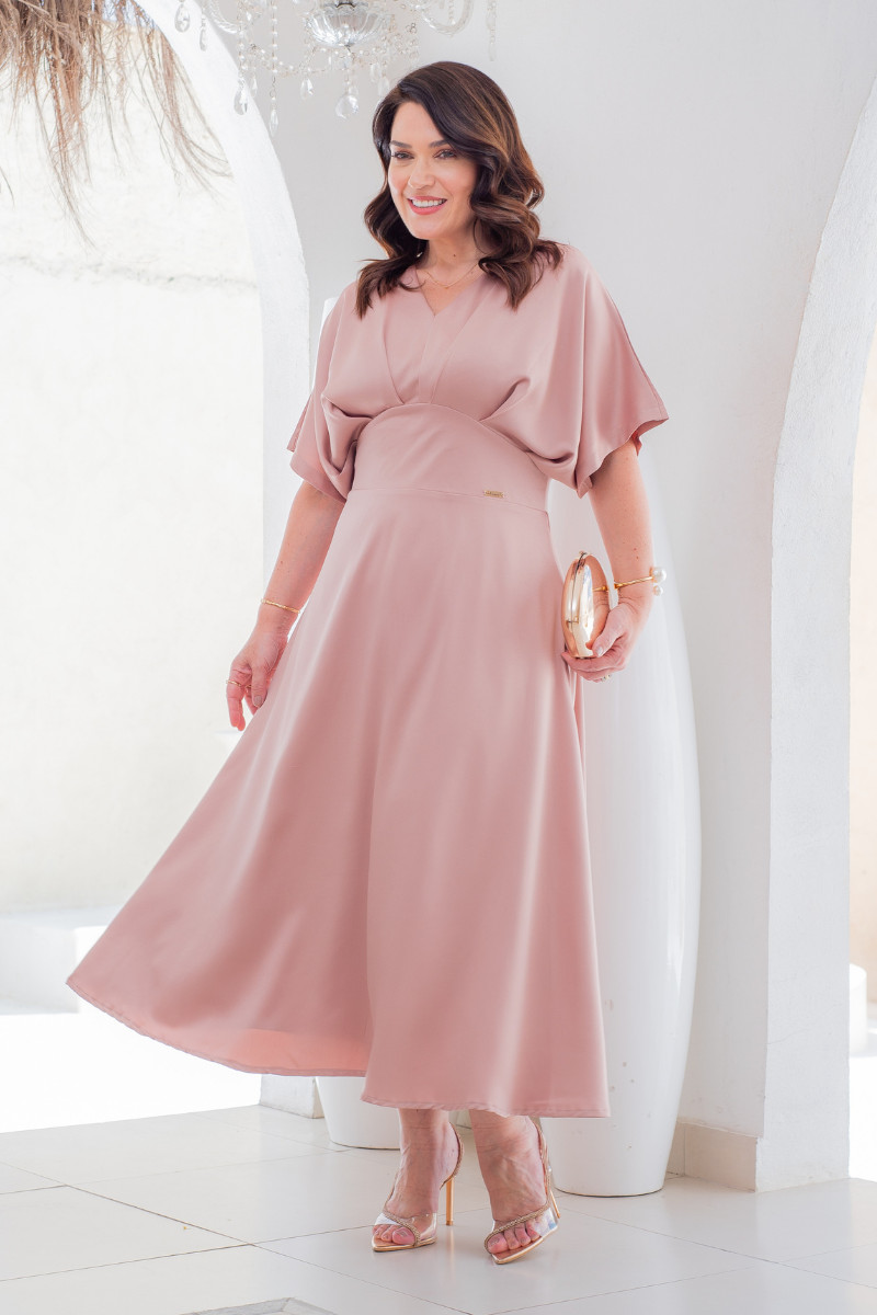 O Vestido midi Élise rose em crepe acetinado foi criado para quem busca presença sem exagero. A peça combina brilho suave, caimento fluido e detalhes que valorizam a silhueta de forma elegante e feminina. Seu design destaca o busto pregueado, a manga morcego e a cintura marcada com recorte empala, criando um visual refinado para ocasiões especiais.