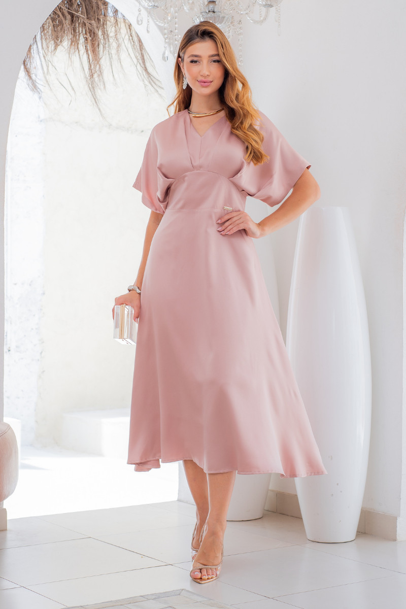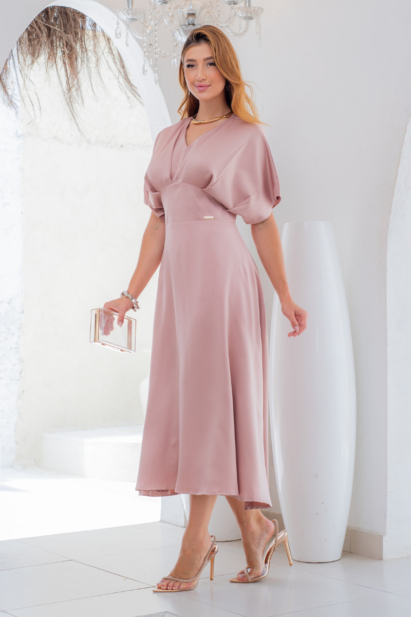 Vestido Midi Élise Rose em Crepe Acetinado – Lecler
