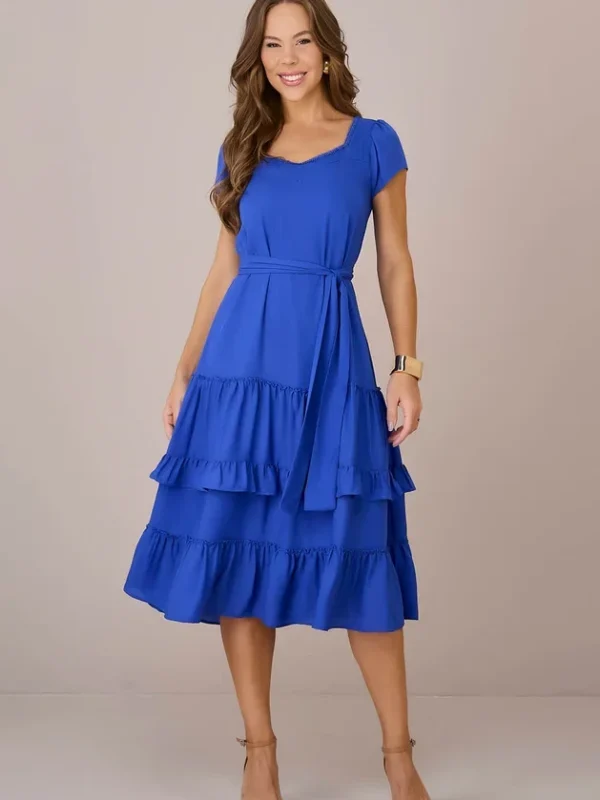 Vestido Mídi Crepe com Renda soltinho Decote Princesa Mangas Curtas com Faixa Eliane – Tata Martello